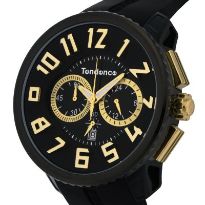 2007年に設立したTendenceの一番初めのコレクションである「GULLIVER Round」のクロノグラフ。 ブランド誕生時より、その圧倒的な大きさと存在感でたくさんの愛用者を生んできたテンデンスで一番人気のコレクションです。ブラックとホワイトをベースにしたモノトーンの配色がコーディネートを選ばず着用できます。腕に合うようにカーブしたシリコンストラップは軽く、腕にフィットするため、ビッグシルエットながらも軽やかな付け心地です。