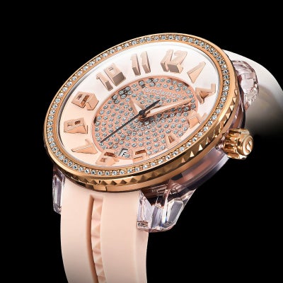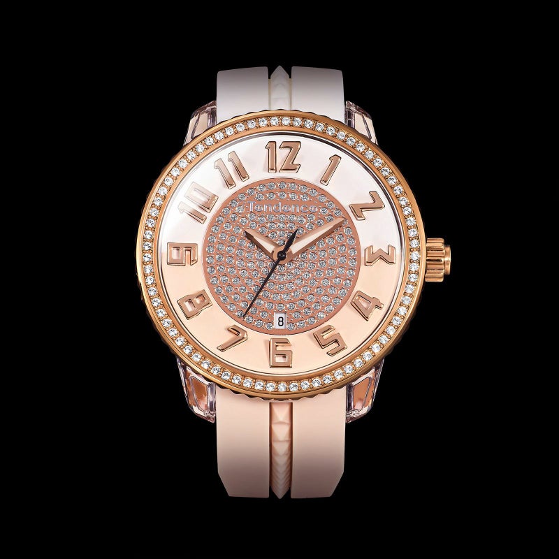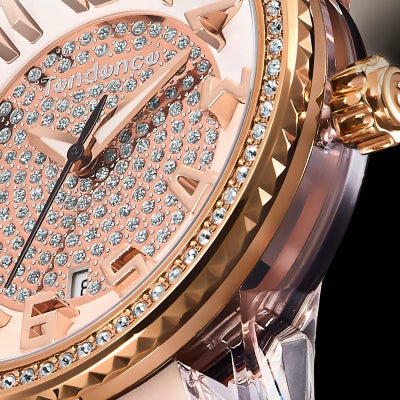 女性に人気の「CRAZY Medium(クレイジーミディアム)」は上下異なるカラーのストラップが特徴の、遊び心あふれるテンデンスらしいコレクションです。本作『SPARKLE(スパークル)』は時計のフェイス周りを囲むベゼルと文字盤中心部分にクリスタルストーンが散りばめられています。フェイスのカラーはパステル調のコーラルカラーとホワイトの上品なコンビネーションで、インデックスやベゼルのローズゴールドが煌びやかで優雅な印象を与えてくれます。
