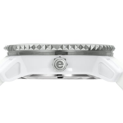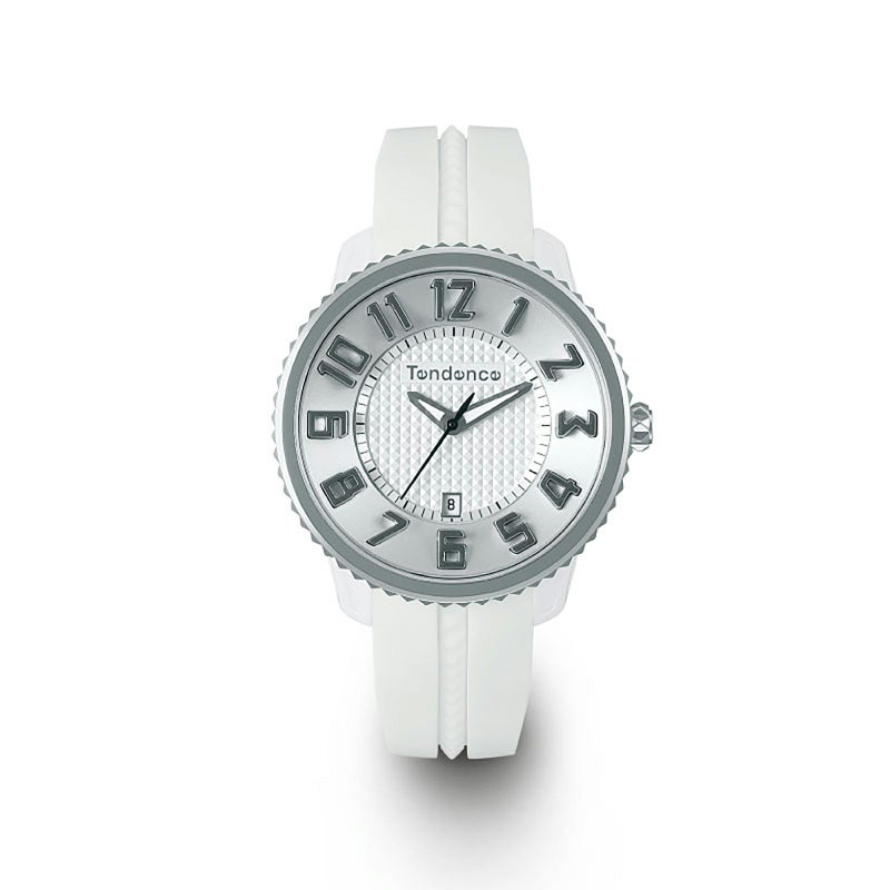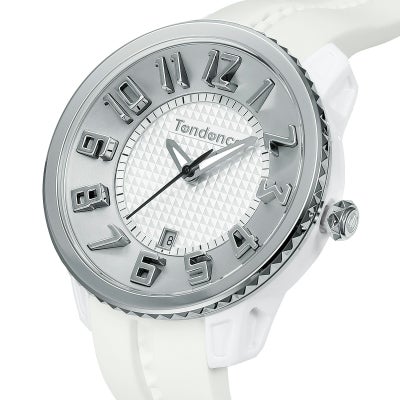 Tendenceを代表する50㎜のオーバーサイズモデル「GULLIVER ROUND」の迫力をそのままに、41㎜にサイズダウンした使い勝手の良いコンパクトな1本。 TendenceのDNAである3Dインデックスを採用し、ダイヤルの中央には、Tendenceのベルトやベゼルにも使用される特徴的なアイコンであるピラミッドを敷き詰め、リューズの側面もピラミッド型をあしらいました。シルバーがアクセントとなったホワイトのモデルは、モードにもカジュアルにも合わせられる王道の1本に仕上がっています。
