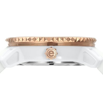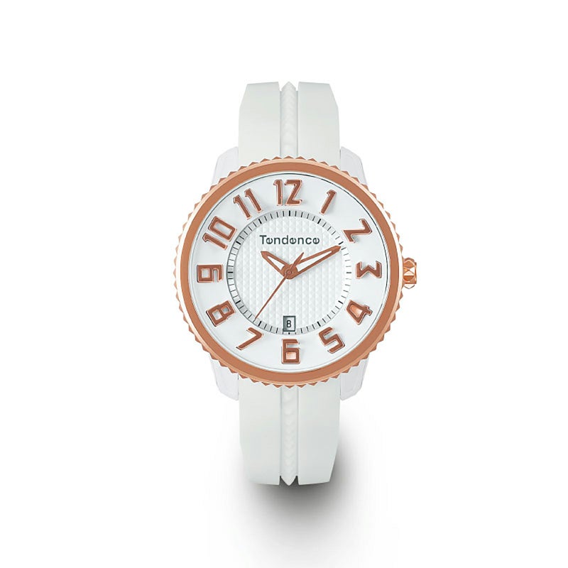 Tendenceを代表する50㎜のオーバーサイズモデル「GULLIVER ROUND」の迫力をそのままに、41㎜にサイズダウンした使い勝手の良いコンパクトな1本。 TendenceのDNAである3Dインデックスを採用し、ダイヤルの中央には、Tendenceのベルトやベゼルにも使用される特徴的なアイコンであるピラミッドを敷き詰め、リューズの側面もピラミッド型をあしらいました。ピンクゴールドがアクセントとなったホワイトのモデルは、華やかさと上品さを併せ持つ、ファッションに合わせやすい1本に仕上がっています。