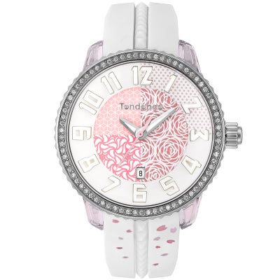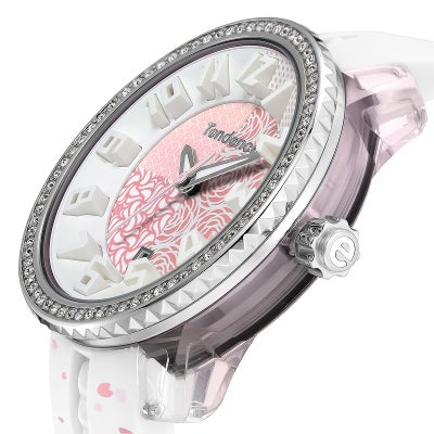 お花をモチーフにデザインした文字盤とベルト。ホワイト×ピンクのカラーリングにより、全体的に女性らしいやさしく華やかな雰囲気に仕上げました。ケースの周りにはクリスタルストーンをあしらい、キラキラと輝くアクセントをプラス。