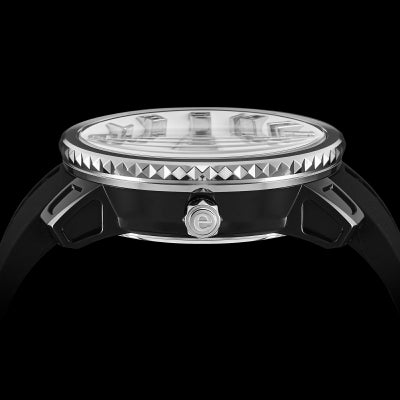 3時位置の「 リューズ」ボタンをワンプッシュすることで、内蔵されているLEDライトが光り輝き、さまざまな表情を楽しめます。LEDライトはライトブルー、レッド、グリーン、ブルー、イエロー、パープル、ホワイトの7色。またすべてがランダムに光るレインボーライトも搭載されています。シーンやコーディネートに合わせて雰囲気を変えられる遊び心のある時計です。