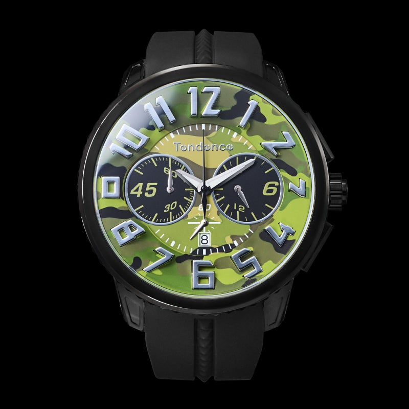 “スタジアム”とも呼ばれるすり鉢状の文字盤を余すところなく使用して「カモフラージュ(迷彩)」をデザイン。インデックスは文字盤から立体的に立ち上がり、圧倒的な存在感を放ちます。 大胆な色遣いの文字盤と対比するように、シリコンストラップは単色で仕上げ、全体としてファッションに取り入れやすいカラーリングに仕上げています。 ケースはナイロン製で、50mmのケースサイズとは思えない軽快な着け心地を実現。高級感あるステンレススチールのベゼルが全体をまとめ上げ、腕元に鮮烈な印象を残します。 100M防水で水辺のアクティビティにも対応。シーズン、トレンド問わず活躍するモデルです。