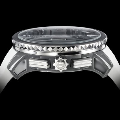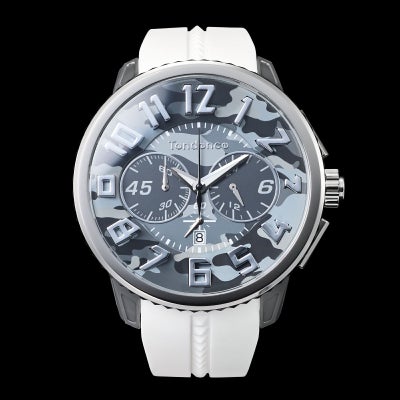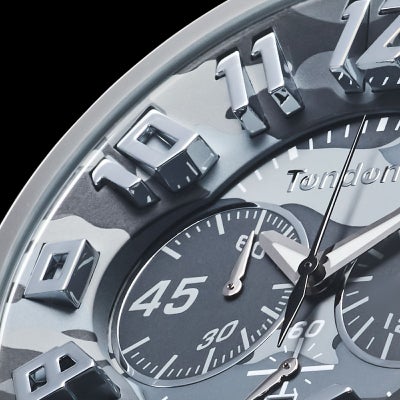 “スタジアム”とも呼ばれるすり鉢状の文字盤を余すところなく使用して「カモフラージュ(迷彩)」をデザイン。インデックスは文字盤から立体的に立ち上がり、圧倒的な存在感を放ちます。 大胆な色遣いの文字盤と対比するように、シリコンストラップは単色で仕上げ、全体としてファッションに取り入れやすいカラーリングに仕上げています。 ケースはナイロン製で、50mmのケースサイズとは思えない軽快な着け心地を実現。高級感あるステンレススチールのベゼルが全体をまとめ上げ、腕元に鮮烈な印象を残します。 100M防水で水辺のアクティビティにも対応。シーズン、トレンド問わず活躍するモデルです。