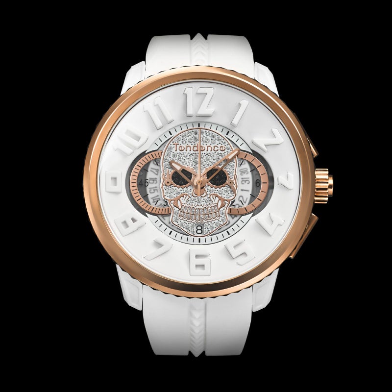 文字盤の中央にラメとスタッズで形成されたテンデンスオリジナルのスカルが煌めく2023年秋の新作『GULLIVER SKULL(ガリバースカル)』。50㎜のケースサイズを誇るテンデンスならではの迫力あるデザインです。 文字盤中央はシースルーになっており、日付のディスクが透けて見えます。スカルをより際立たせるため、秒針を排した2針仕様で、腕に沿うようにカーブしたシリコンのストラップとナイロン製のケースが軽快な着け心地を実現しています。