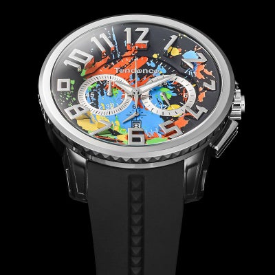 色彩がキャンバスに飛び散る「アクション・ペインティング」のようなアートを文字盤に大胆にデザイン。