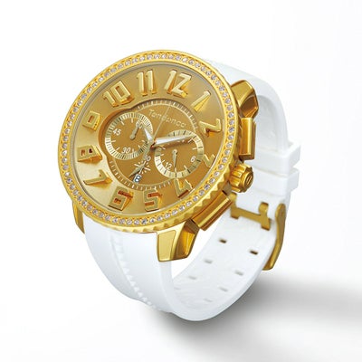 「ガリバーラウンド」にアルミニウムを使用したコレクション。ビッグフェイスでありながら、軽量かつ耐久性を備えた1本です。また素材の特徴によりカラーリングが鮮やかに映えるので、マットな質感とも相まって高級感と立体感を楽しめます。大人っぽい雰囲気でビビットな色が取り入れやすいこともポイント。ゴールドのケースにより、ラグジュアリーな雰囲気を表現しています。