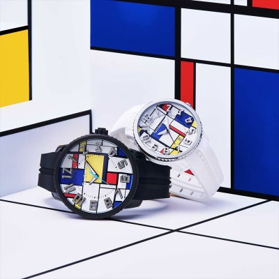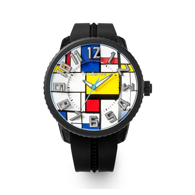 文字盤全体にピート・モンドリアンの名作「コンポジション」をあしらった時計は、インパクトあるルックスが特徴。カラフルであるものの、計算されたグリッドデザインゆえの落ち着いたエレガンスも兼備します。Tendenceにおける定番、GULLIVER Roundの持ち味である立体インデックスとの相乗効果により、遊び心にあふれたアートウォッチとして完成しています。