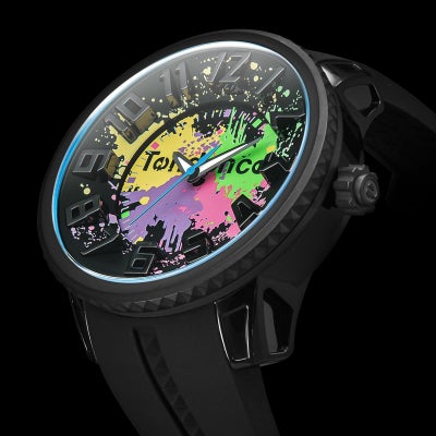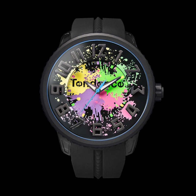 キャンバスに絵具をこぼした様なダイナミックなデザインが特徴的な新作『GULLIVER Splash(ガリバースプラッシュ)』。2023年9月に数量限定で発売された本モデル「GULLIVER Splash(ガリバースプラッシュ)」は発売後即完売し、その後も再販リクエストを数多くいただきました。そして、この度新たに3種類が加わります。ブラックカラーをベースとした50mmのオーバーサイズの文字盤に淡いパステルカラーやビビットカラーがアクションペイントアートのようにデザインされています。ダイヤルのデザインには蓄光パウダーを加えた特殊なペイントを採用しており、暗闇でもデザインを楽しむことができ、蓄光仕様の時分針で時間確認もできます。