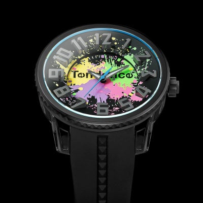 3時位置の「 リューズ」ボタンをワンプッシュすることで、内蔵されているLEDライトが光り輝き、さまざまな表情を楽しめます。LEDライトはライトブルー、レッド、グリーン、ブルー、イエロー、パープル、ホワイトの7色。またすべてがランダムに光るレインボーライトも搭載されています。シーンやコーディネートに合わせて雰囲気を変えられる遊び心のある時計です。