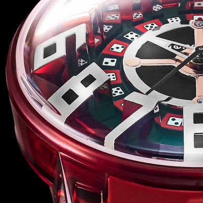 Diceはサイコロをモチーフにしたモデルです。ルーレットのバーを模したディスクが回転し、インデックスの内側を囲むように配置されたサイコロの目を指します。遊び心あふれるタイムピースです。
