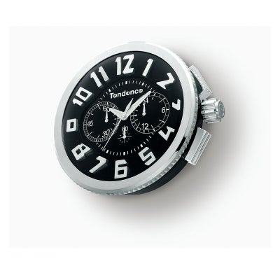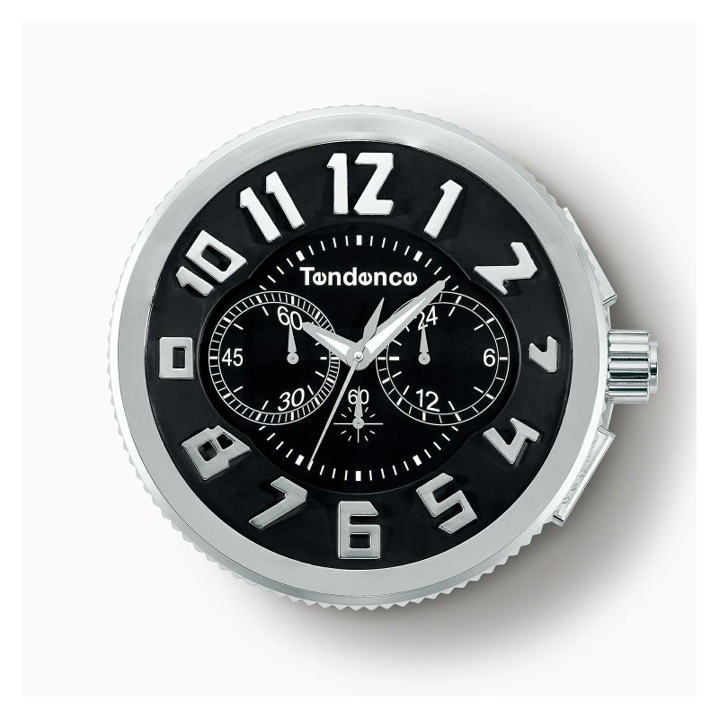 テンデンスの3D立体インデックスと、ケースサイドのピラミッド型の模様を受け継ぎ、ウオッチのデザインをそのまま36cmのクロックに仕上げました。また、実際に機能はしませんがサイドのクロノグラフプッシュボタンも忠実に再現されており、テンデンスファンだけでなく、部屋のインテリアとしても楽しめる、視認性とデザイン性の高いユニークなクロックです。