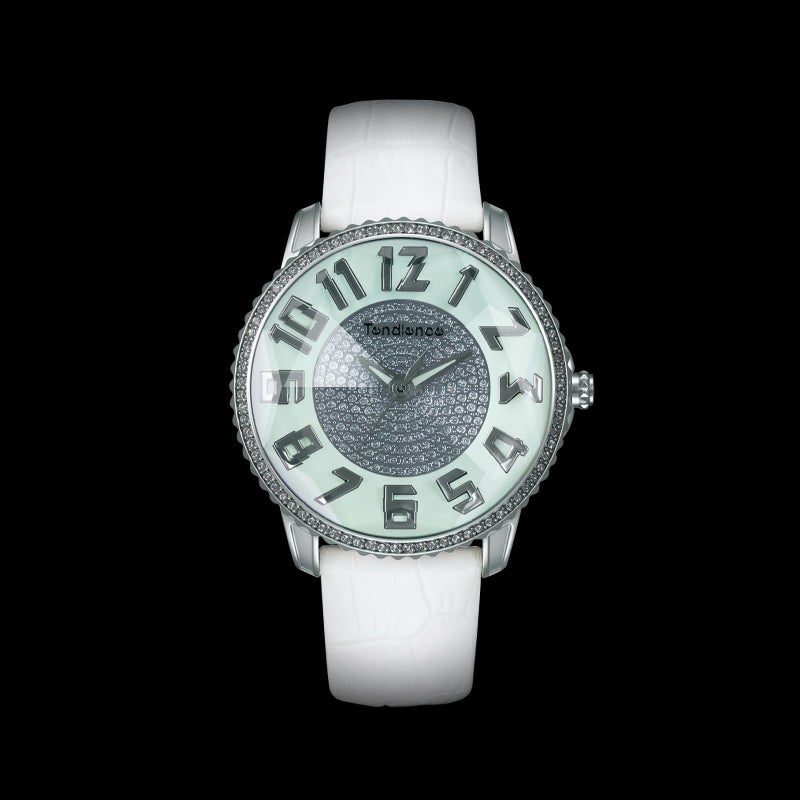 3Dダイヤモンド加工をガラス全体に施し、光の反射によってキラキラと輝きます。ベゼルにはクリスタルガラスを使用。腕元にエレガントな印象を与え、シーズン問わずコーディネートにインパクトを与えてくれます。 ストラップは上質な型押しのカーフレザーを採用。バックルはTendenceでは初となるDバックル(開閉)式を採用し、時計の着脱が快適に。また、ベルトの劣化も防げるので長い間“美しく”ご使用いただけます。