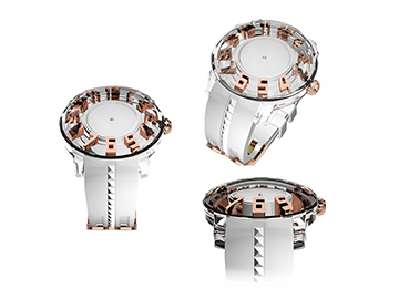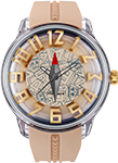 ログポースをテンデンスの KingDome でデザインした際のシミュレーション3Dデザイン。ガラスとケースをクリアにすることで時計の統一感を図り、立体的ながら圧迫感を少なくする視覚効果を採用。また、ログポースのストラップのカラーを全体となじませるために、ダイヤルもあえてベージュカラーにし、中心のログポースの針がアクセントになるようデザイン。インデックスのゴールドカラーは、「お宝」のゴールドをイメージしています。