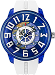 ONE PIECE の世界観をテンデンスの KingDome でデザインした際の最終シミュレーション 3D デザイン。ケースは大海原をイメージした深いブルーを採用。数字部分は回転ダイヤルを生かすために同カラーのシルバーで爽やかに統一。ダイヤル最下部にはイーストブルーの海図をデザインしています。回転ダイヤルのモチーフには船の舵を採用。12 時位置の赤い印でラッキーな方向を探す遊び心はテンデンスウォッチの特徴でもあります。