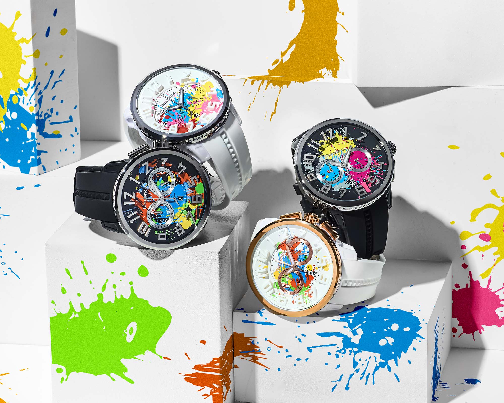 色彩がキャンバスに飛び散る「アクション・ペインティング」のようなアートを文字盤に大胆にデザイン。