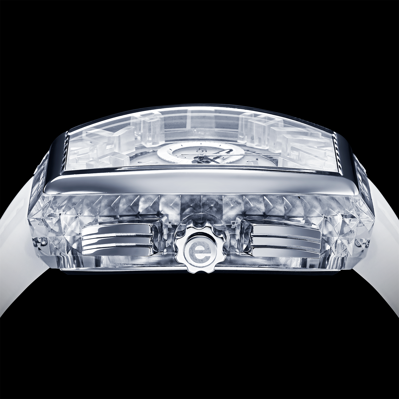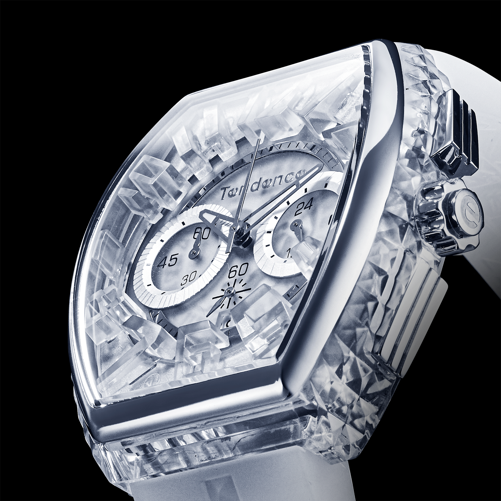 テンデンスのDNAともいえる3Dインデックはトノー型にアップデート。シースルーのシリコンストラップとケースは滑らかに接続され、腕に心地よくフィットします。