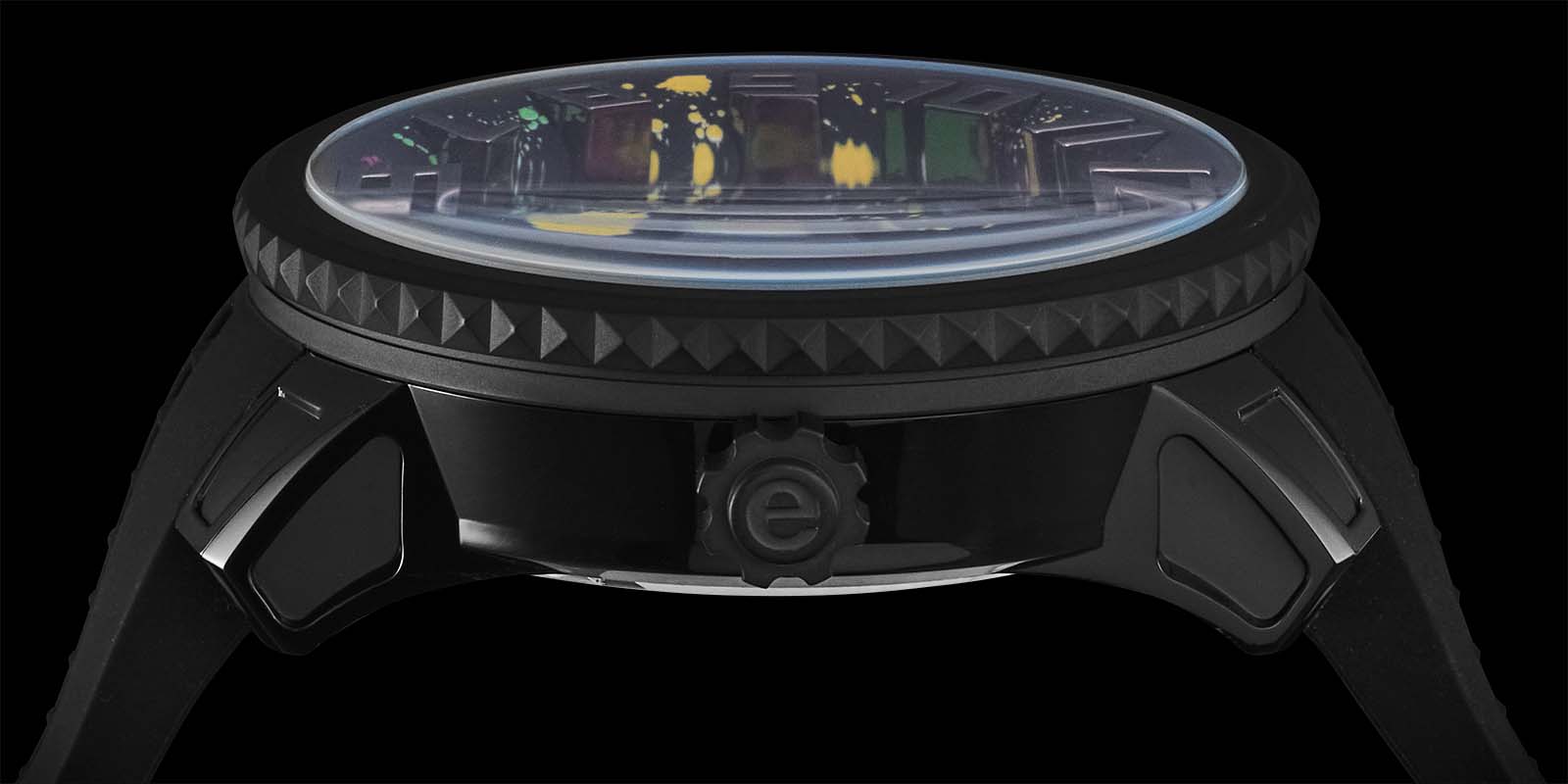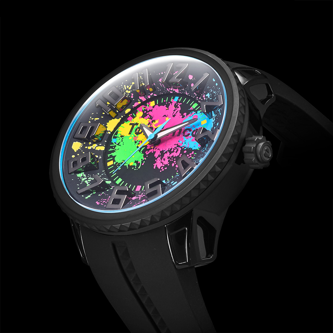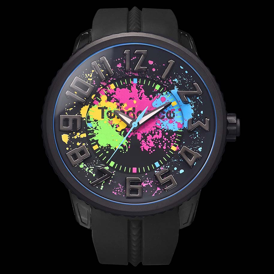 文字盤にペンキを散らしたようなインパクトあるデザインが目を引きます。