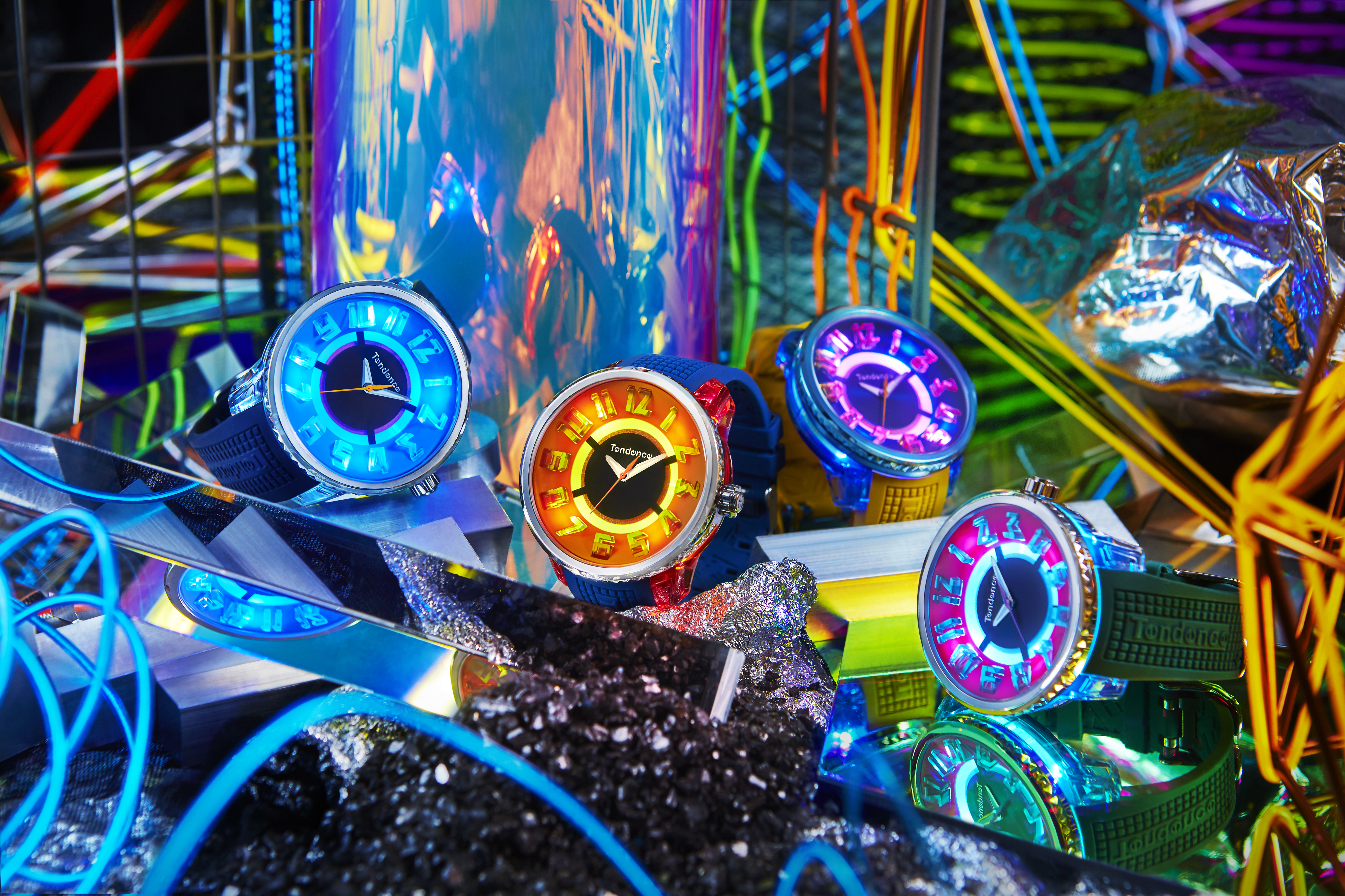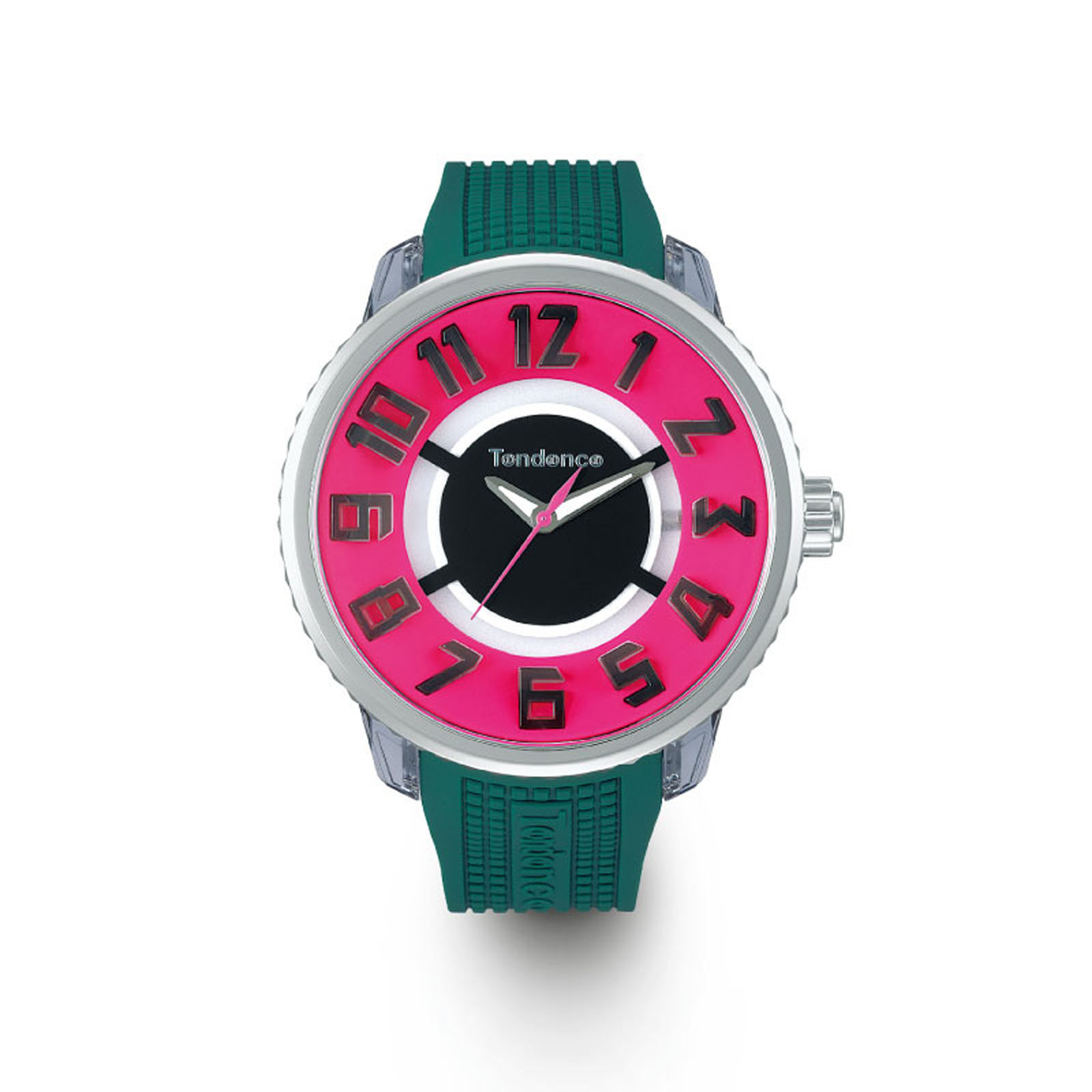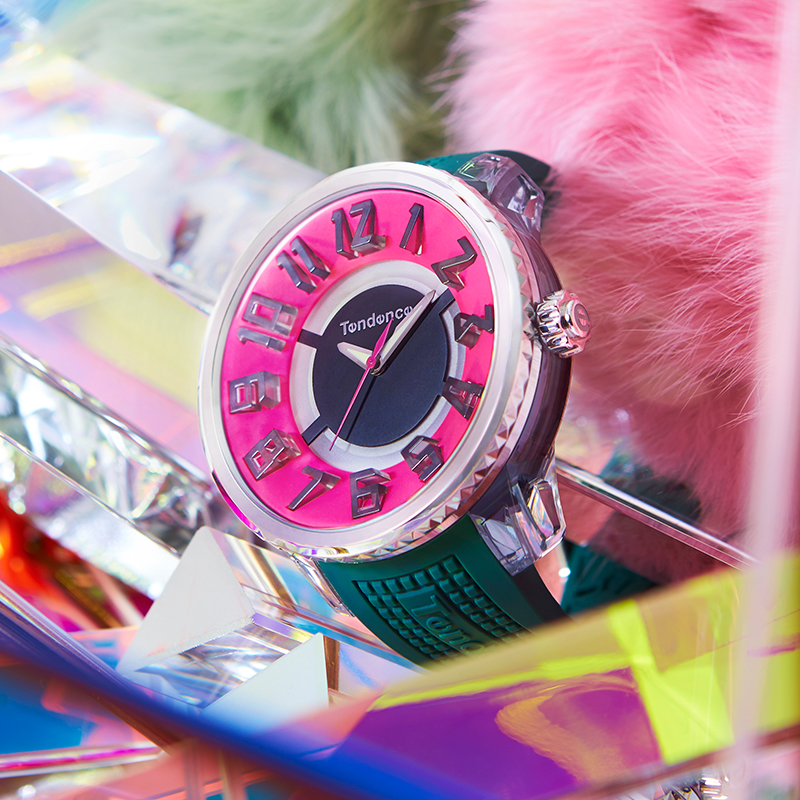 ピンク/ブラックのダイヤルにグリーンストラップ。主張の強いカラーを透明なクリアケースが中和する絶妙なバランスが特徴。