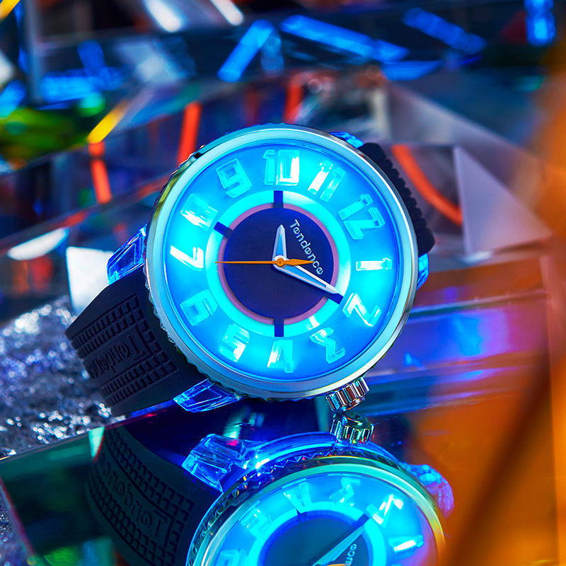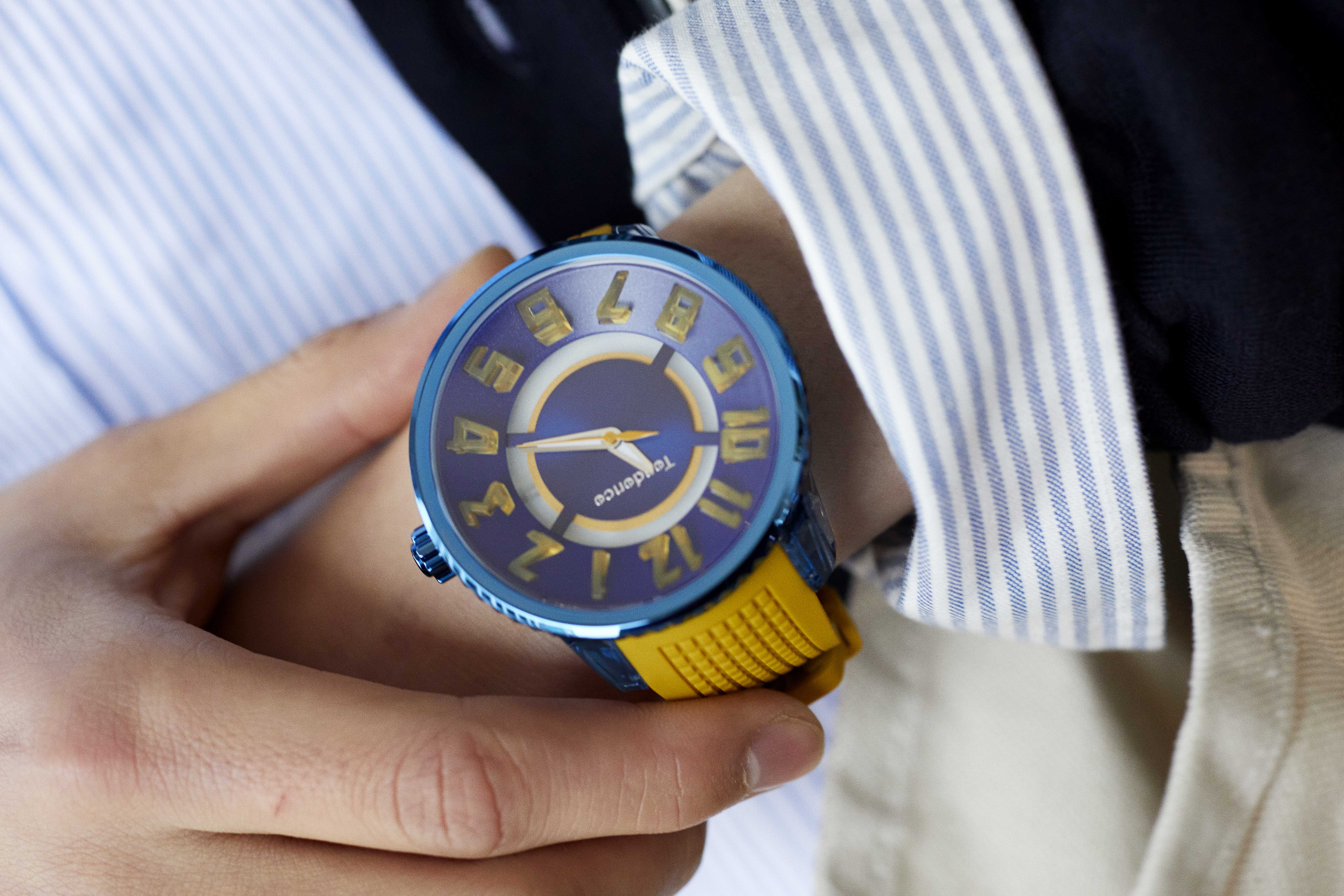 クリアなライトブルーのケースとダイヤルにブラックストラップを合わせた爽やかな組み合わせ。差し色に使用したオレンジがアクセントに。
