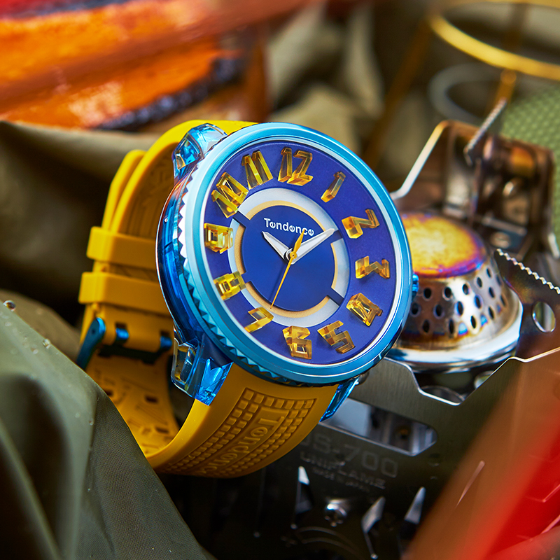 パワーを貰えそうなブルーとイエローのカラーコーディネート。今シリーズ唯一ベゼルもブルーPVD加工を施し、全体の統一感を追求しました。