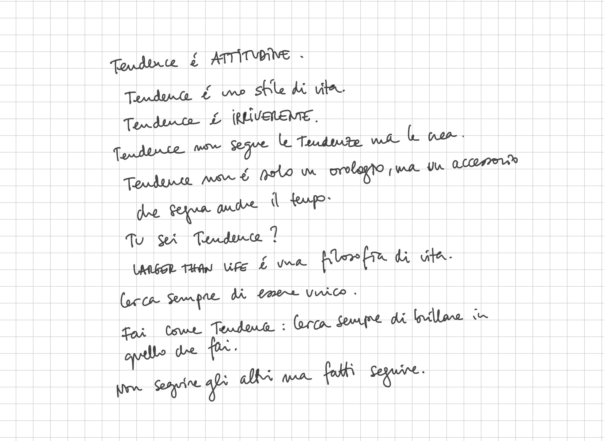 「トレンドに乗るのではなく生み出すこと」、「テンデンスの時計はただの“腕時計”ではなく、時刻を知らせることが出来るアクセサリーであること」など10の信念が記載されています。