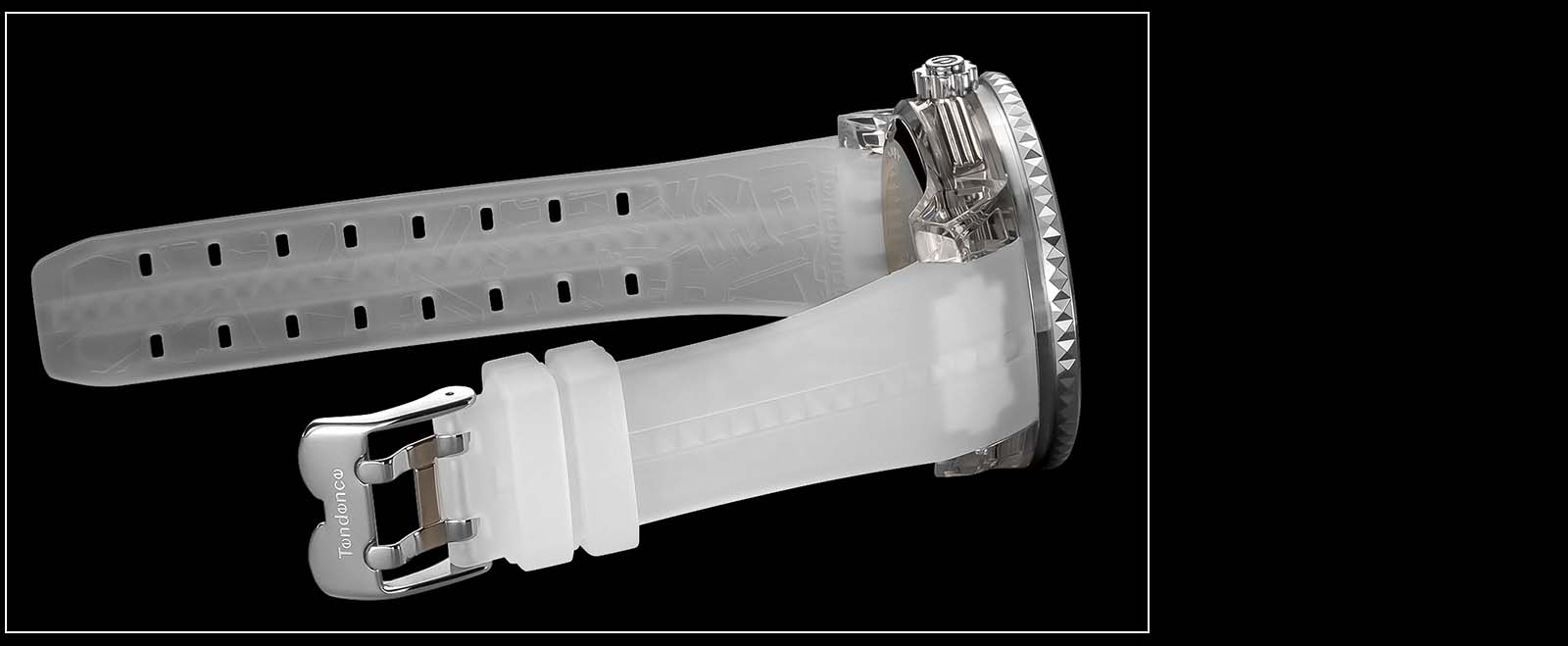 テンデンスを象徴する3Dインデックスはもちろん、文字盤にもクリア素材を使用することにより、カレンダーディスクが透けて見え、より奥行きを感じることができます。ストラップもシースルーを採用し、徹底的に透明感を演出しました。