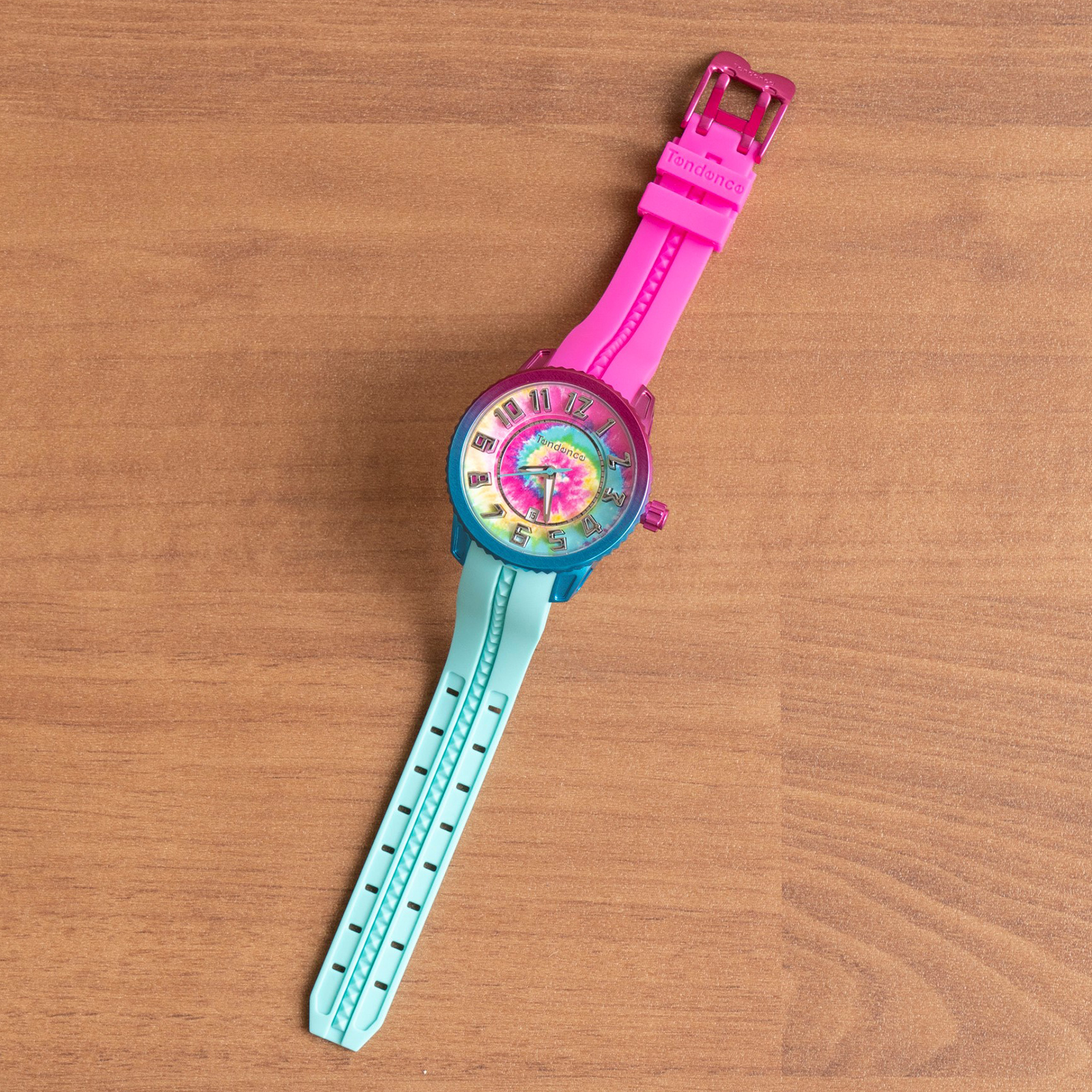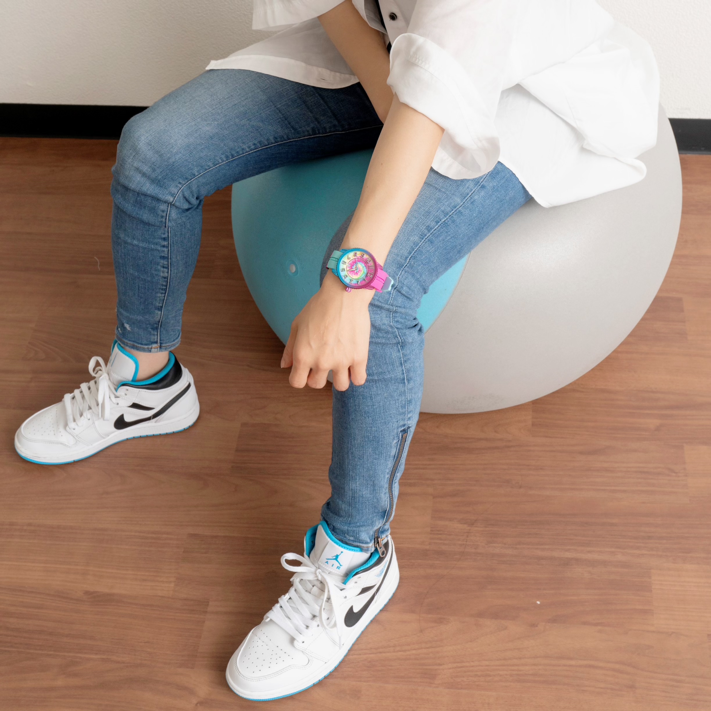 3x3、NPOの理事、会社員…と多忙な有明さんにとって、時計は必需品。仕事の時はスマートウォッチだが、プライベートの時はファッションに合わせて選ぶようにしているとか。今日着けている『TIE-DYE Collection』は、サイケデリックなタイダイ柄を立体的に表現したコレクション。ポップなカラーリングが女性に人気の1本だ。