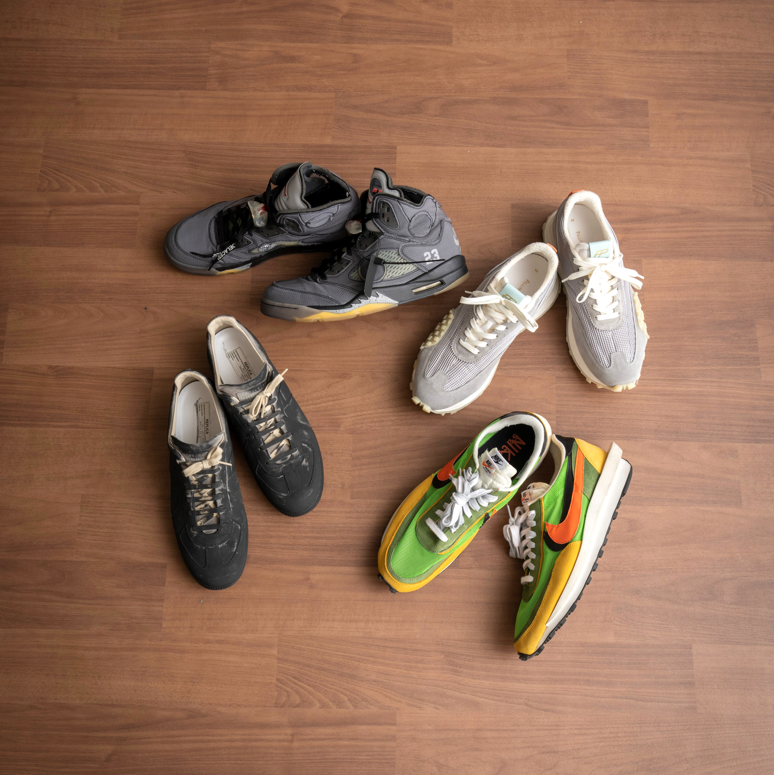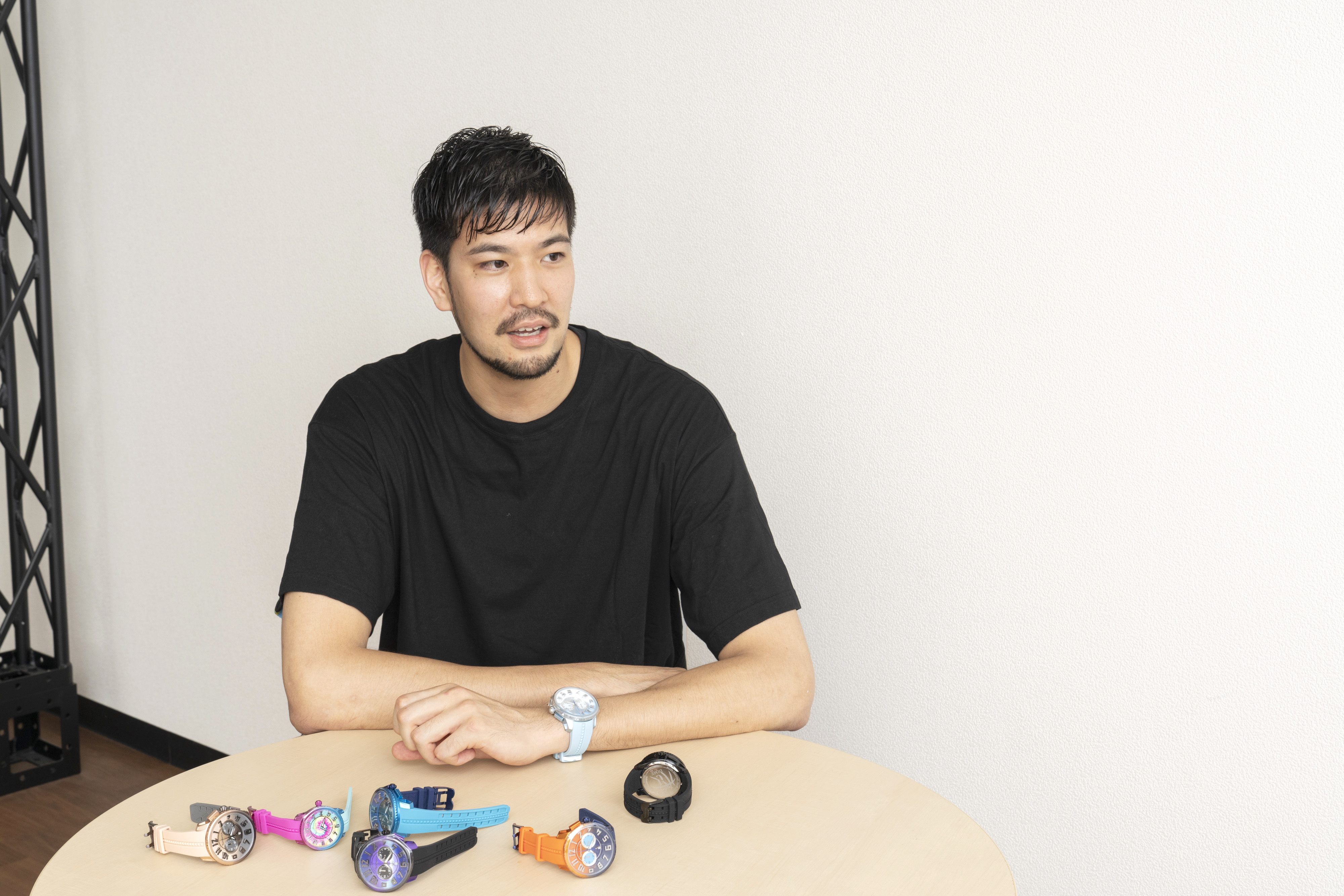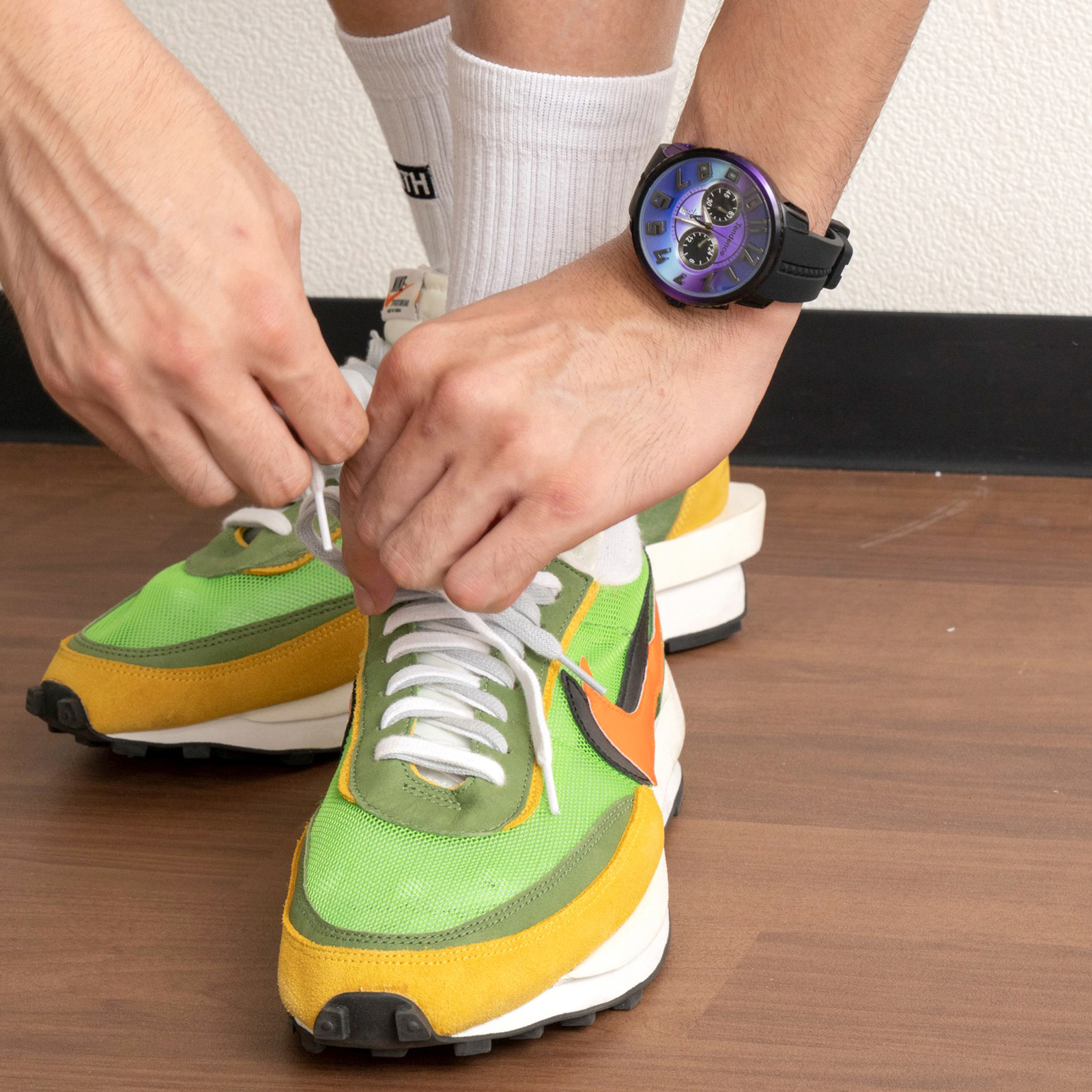 「履いているスニーカーはポップなカラーリングですが、基本的にはアースカラーやモノトーン系が多くて。このディカラーのような割と落ちついた色味の時計は僕が持っているスニーカーたちと色のトーンが合うので好きですね。こっちのナイキ×オフホワイトの『エアジョーダン5』(※スニーカー写真左上)に合いそう」