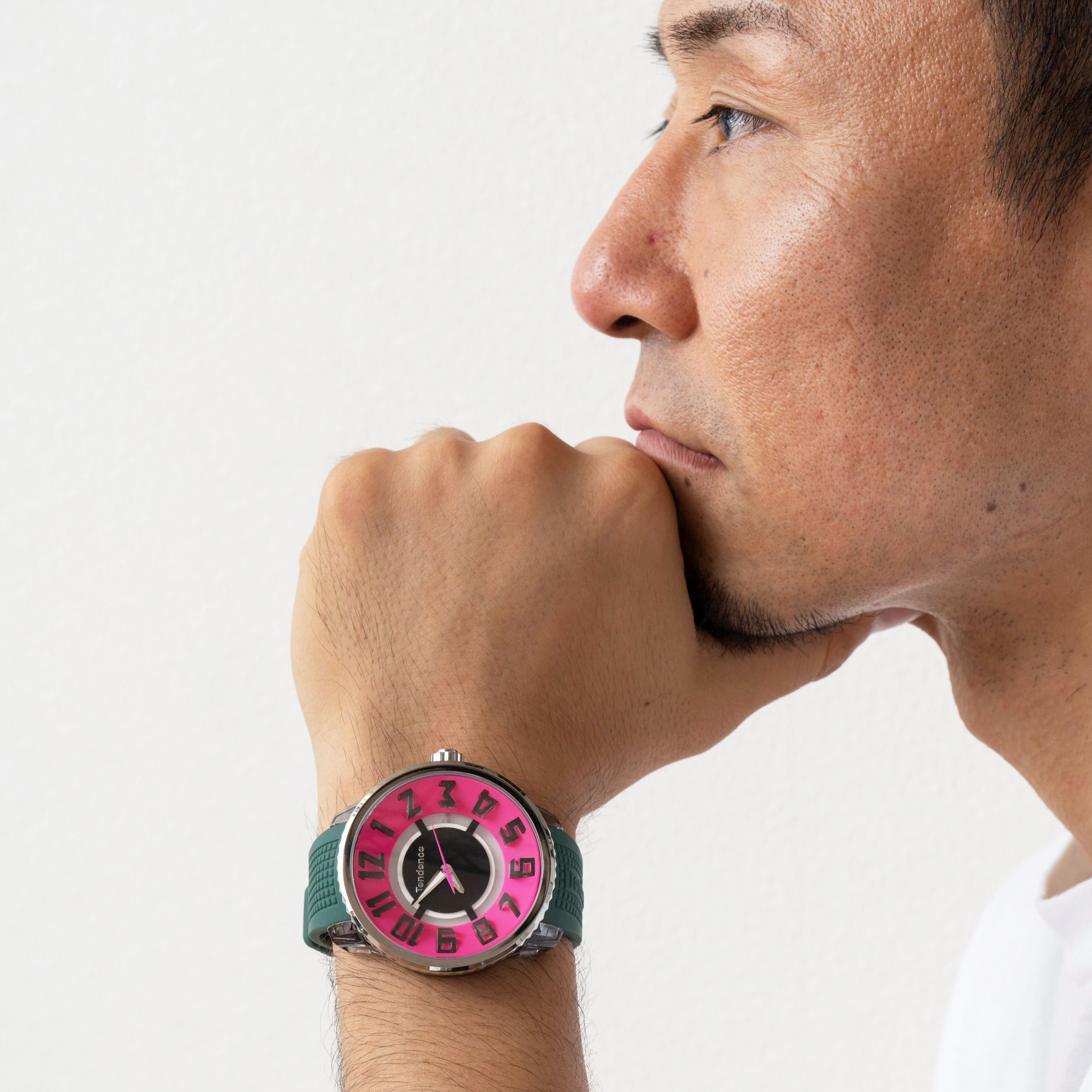 すでに今月末発売されるテンデンス×TOKYO DIMEのコラボモデルも入手しているそうで、そちらの文字盤はチームカラーのグリーンが鮮やかな1本となっている。