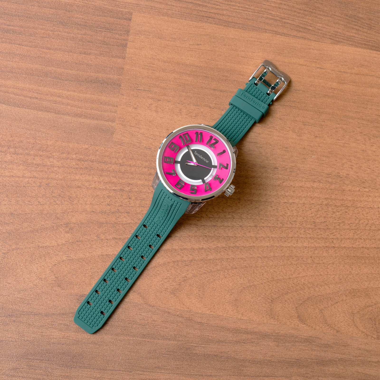 「靴に合わせてグリーンベルトのテンデンスをチョイスしました。ビビッドなピンクの文字盤もインパクトがあって気に入ってます!」