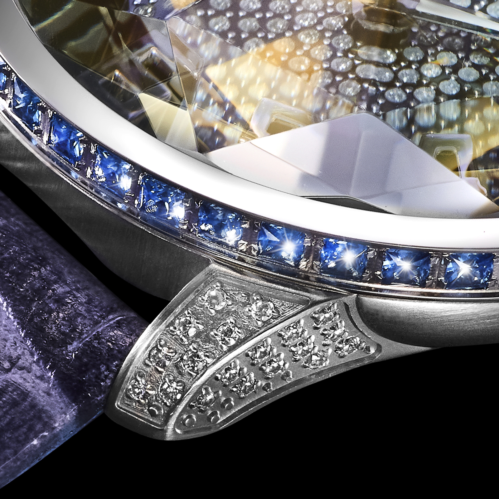 ケースサイドには明るいネイビーカラーのキュービックジルコニアを、ラグ部分にはクリスタルガラスを配置することで、夜空に輝く星を表現。