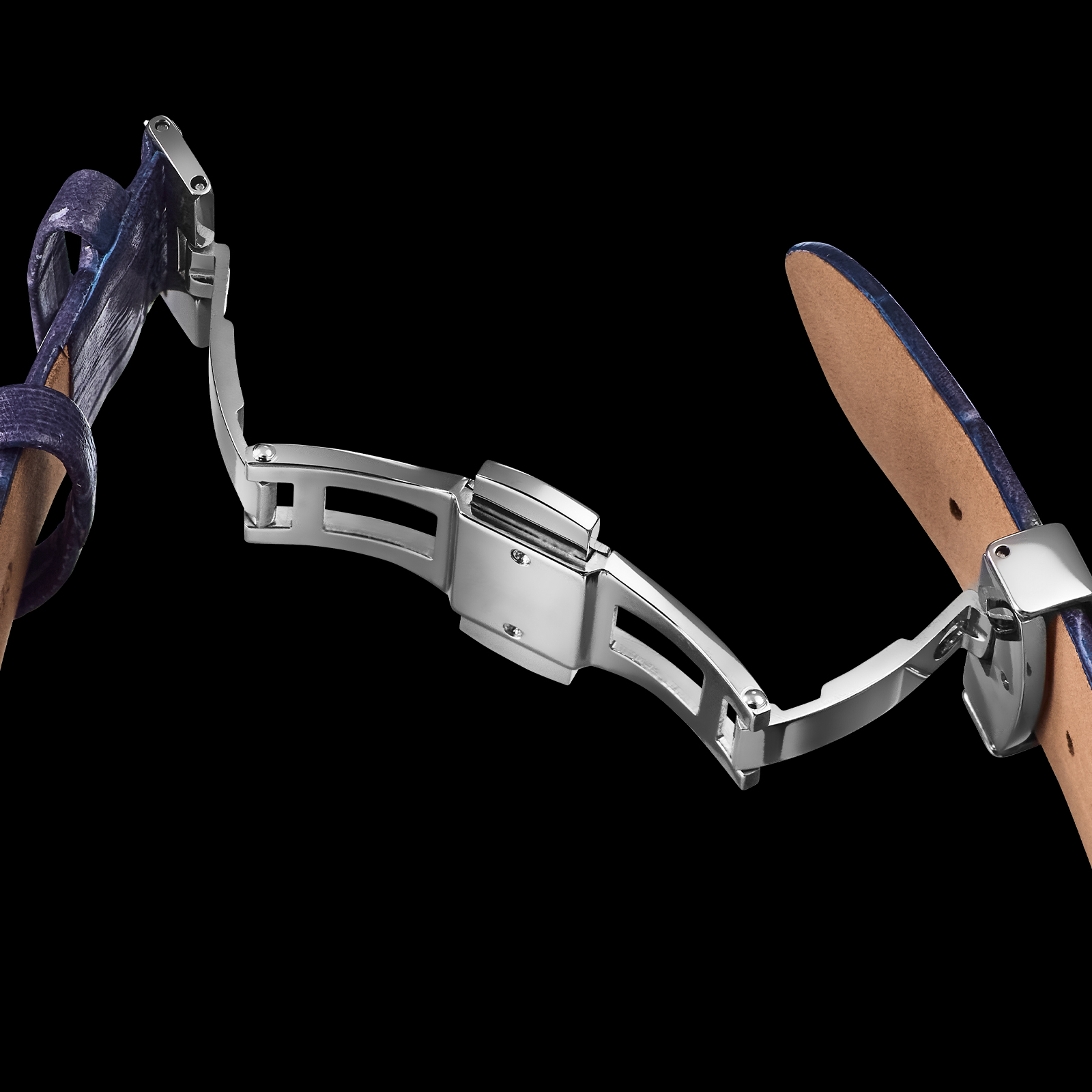 ネイビーカラーのレザーベルトにDバックルを採用。片手で簡単に着脱ができ、また、着用時の時計の落下を防止することもできます。