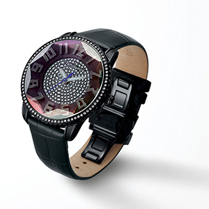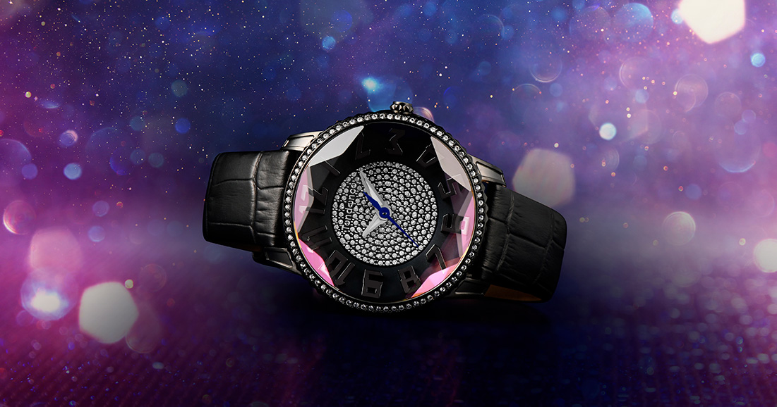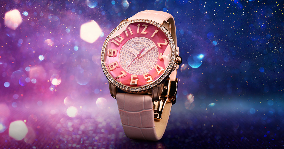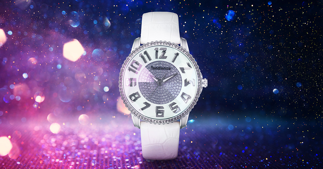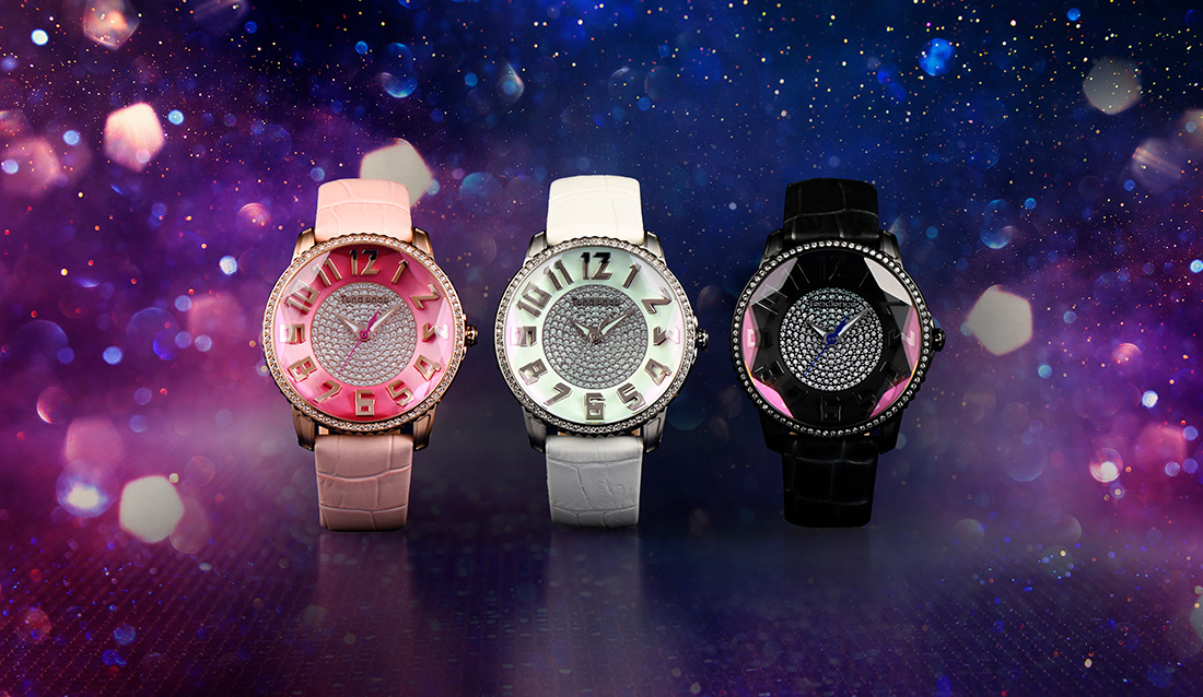 3Dダイヤモンド加工をガラス全体に施し、光の反射によってキラキラと輝きます。ベゼルにはスワロフスキー®・クリスタルを使用。腕元にエレガントな印象を与え、シーズン問わずコーディネートにインパクトを与えてくれます。